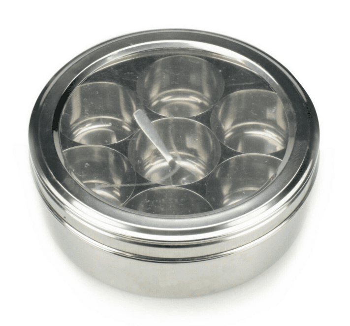 An Indian Spice Box is used to store spices. Most Indian households will have at least one in use storing the most commonly used spices so everything is to hand in one tin instead of opening up 7 different pots/packets.