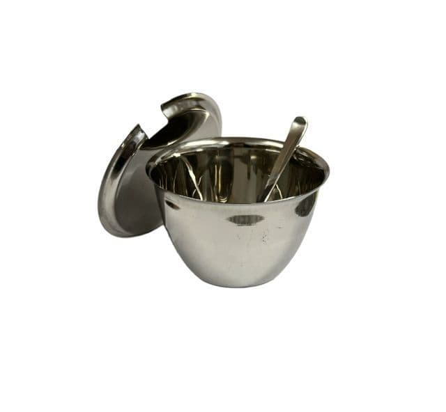 Versatile stainless steel pot with its own lid and spoon. Perfect for serving condiments, dips, ghee & more. Simple and very useful.Approx dimensions: