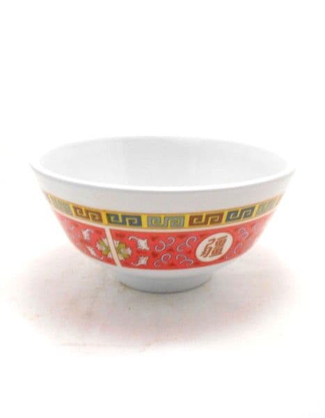 Melamine bowl with red oriental design, perfect for serving Asian inspired soups and rice dishes. Matching spoon available.